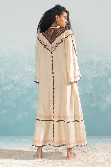 Beige Chanderi, Cotton Embroidery, Applique High Nile Yoke Cut-work Maxi Dress
