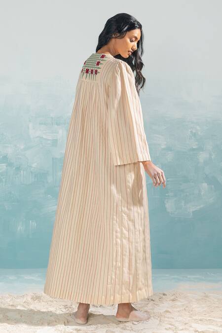 Buy_Ikai By Ragini Ahuja_Beige Chanderi, Cotton Applique, Cut Work Round Neck Nile Yoke Gathered Dress_at_Aza_Fashions