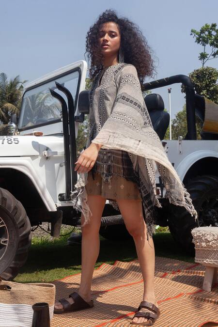 Buy_Kritika Murarka_White Cotton Ikat Motifs Jewel Neck Boho Kaftan Top_at_Aza_Fashions