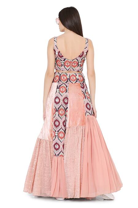 Red choli with ikat eye prints in art silk bae with embroidered details. Paired with printed skirt with embroidery, coral organza, chanderi stripe & georgette panels.