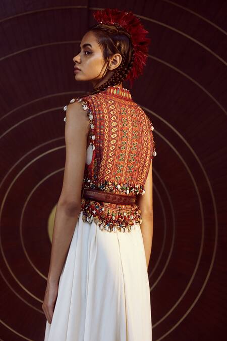 Red jacket with ikat printed motifs, kantha embroidery and mirror work. Comes with flared jumpsuit.
