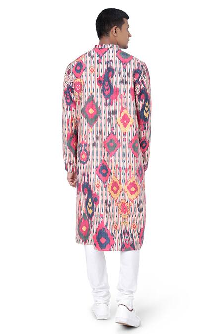 Red dupion silk bomber kurta with ikat tribe print & front zipper. Paired with off white cotton silk churidar