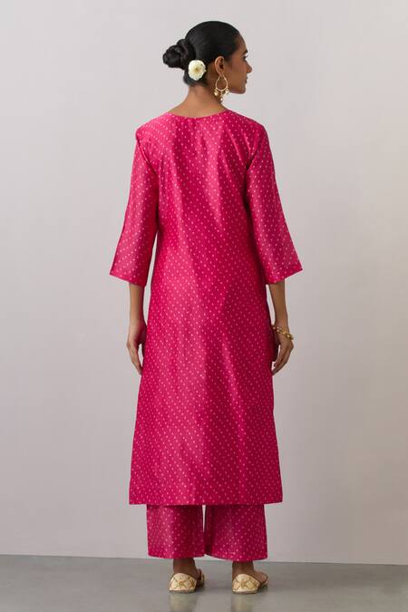 Pink kurta featuring bandhani prints and floral embroidery on the yoke. Paired with matching pants, it is made from Chanderi silk with an attached lining and elasticated back waistband.