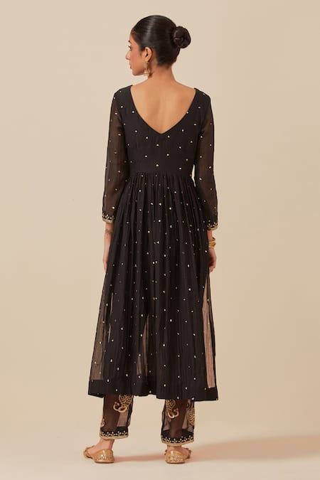 Black Anarkali featuring sequin hand embroidery and gathered detail. Paired with embroidered pant with elasticated back closure.