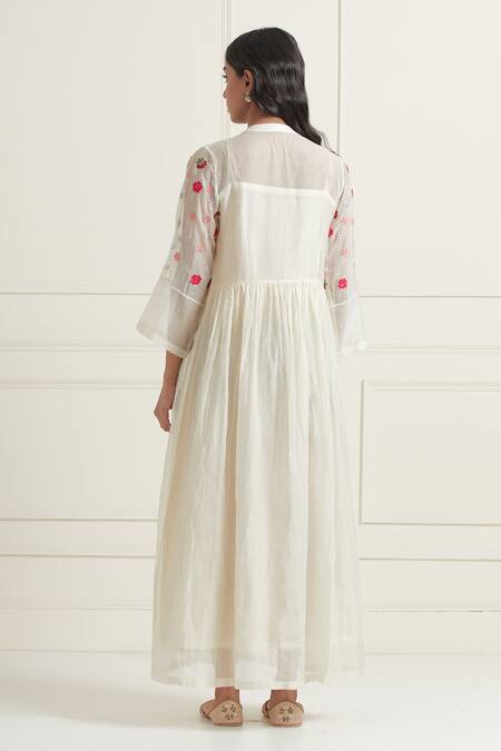 Floral hand embroidered placket, Gathered detailing at waist, Shell buttons on placket
