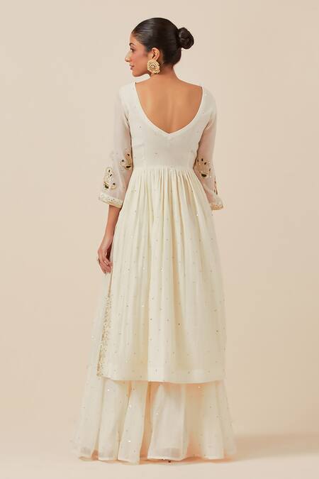 White anarkali featuring sequin hand embroidery with peacock motifs on sheer sleeves and gathered detail. Paired with a flared pant that also showcases sequin work.