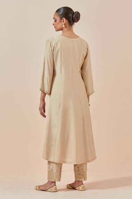 Beige Chanderi Silk, Tissue Embroidery V-neck A-line Kurta Pant Set