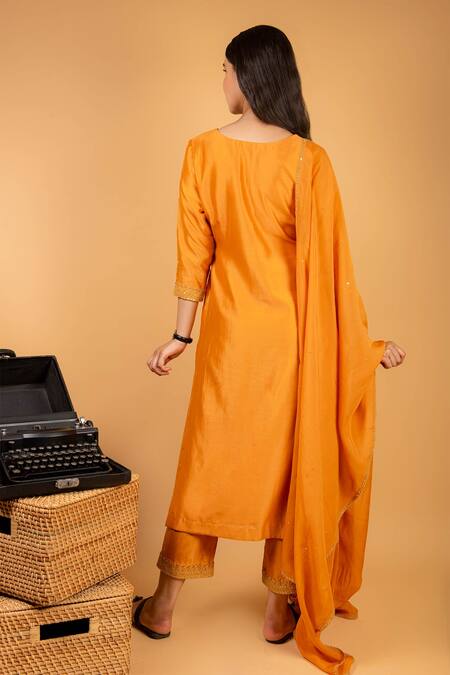 Mustard yellow chanderi silk kurta with embroidered floral motifs, round notched neck. Paired with pant in sequins embroidery along the hem.