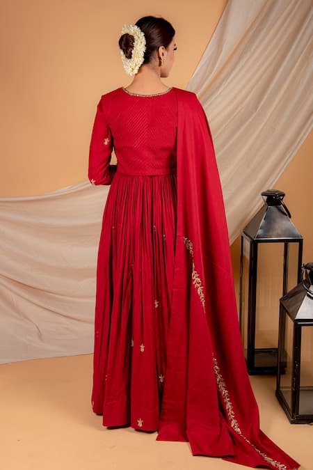 Red anarkali with floral embroidered motifs & pleated detailing. Paired with dupatta & jacket.