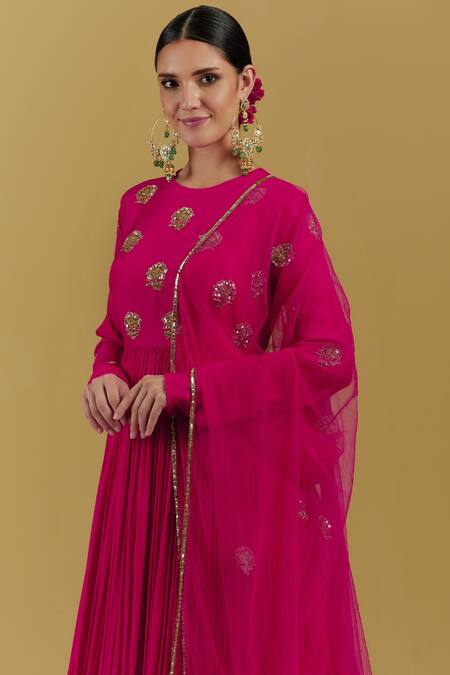 Magenta Net Hand Embroidered Sequin And Zari Work Floral Dupatta