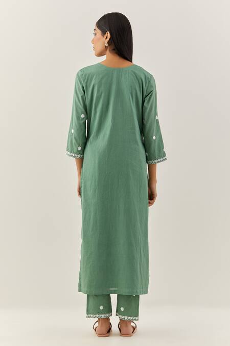 Green Cotton Embroidery Floral Notched Kurta And Pant Set