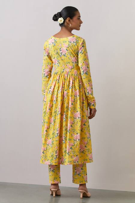 Yellow anarkali featuring gathered details, V neckline, and floral printed motifs. Paired with a matching printed pant.