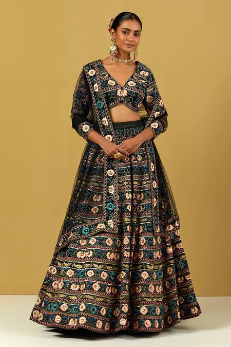 Black dupatta featuring multi-colored floral pattern hand embroidered borders