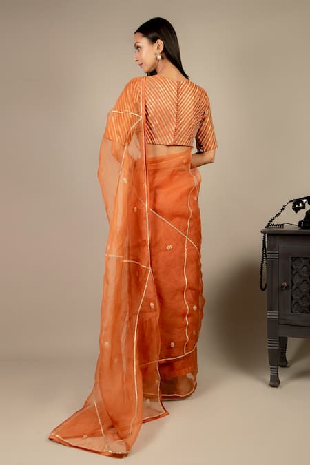 Orange saree in organza base with embroidered floral buttis. Paired with chanderi blouse. Comes with satin petticoat.
