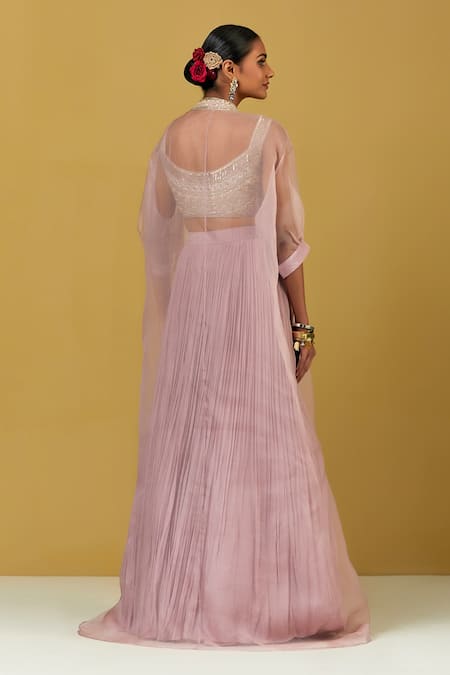 Purple embroidered cape featuring sheer sleeves and open neckline. Paired with an embroidered crop top and pleated skirt.