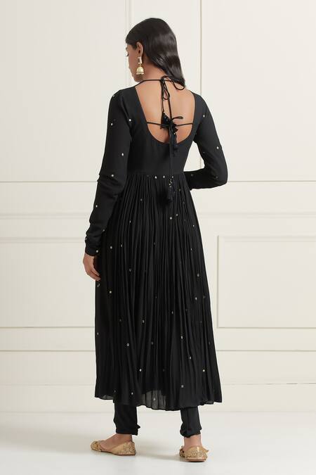 Black wrinkle cotton anarkali featuring churidar sleeves and gathered flare with all over metallic sequin and zari embroidery. Paired with a gathered churidar featuring an elasticated waistband.