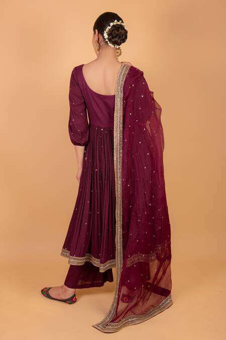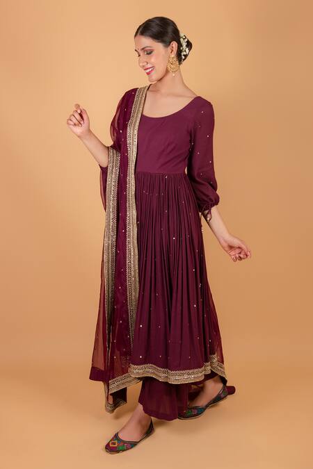 Maroon anarkali with sequin embroidery, front gathers and drawstring tie-up puff sleeves. Paired with maroon cheese cotton palazzo.