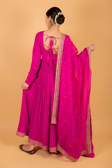 Magenta anarkali kurta with placed sequins, embroidered hem and chudidar sleeves.