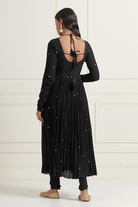 Black Cotton Embroidery, Sequins, Zari Round Neck Gathered Anarkali Set