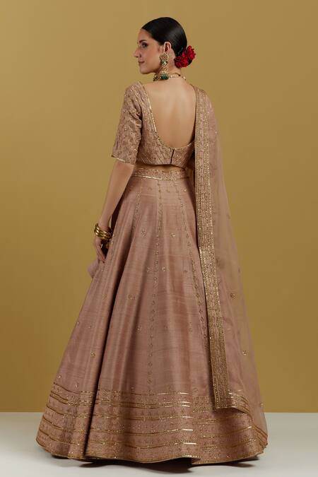 Dust pink lehenga in a raw silk base with all-over scattered sequin embroidery and striped embroidered border.