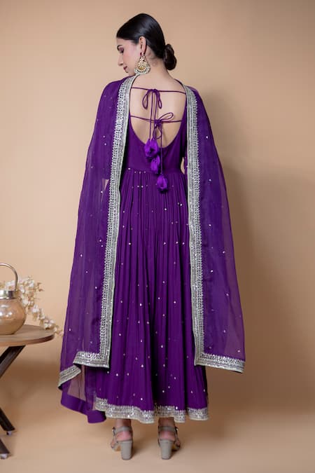 Purple sequined organza dupatta with chita embroidered border.