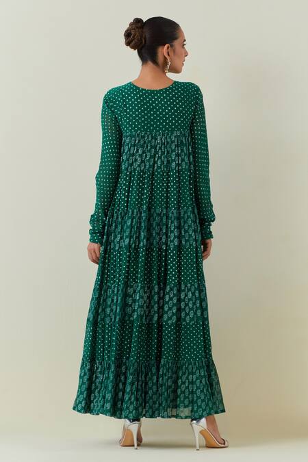 Green Anarkali featuring floral and dot block print with tiered panels. Paired with a churidar and dupatta for a complete look.