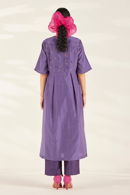 Purple kurta featuring bead embroidered heart patterns on a heart motif base and an empire waistline. Paired with matching pant for a coordinated look.