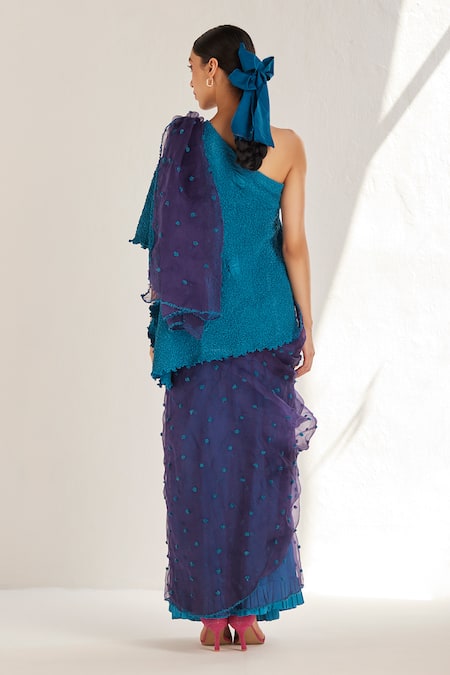 Purple saree featuring polka threadwork embroidery. Paired with a one shoulder smocked blouse in cotton satin.