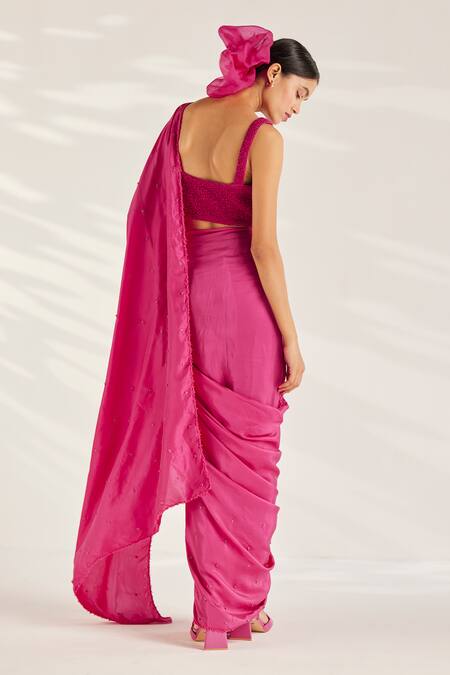 Pink Silk Sequins, Beads Round Neck Muse Smocked Saree With Blouse