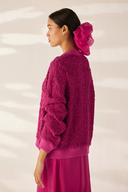 Fuchsia Cotton, Silk Beads, Sequins Open Neck Smocked Bomber Jacket