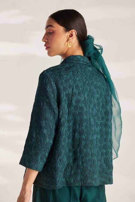 Green Cotton Satin Collared Smocked Pattern Jacket