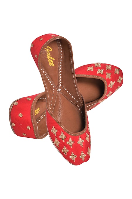 Red silk juttis featuring all-over gold-tone floral motif dori and sequin work