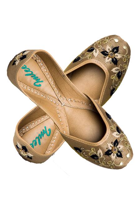 Golden brown silk juttis featuring all-over floral motif thread and got patti work