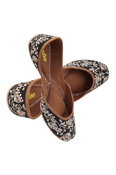 Black silk juttis featuring intricate pittan embroidery and a cushioned sole