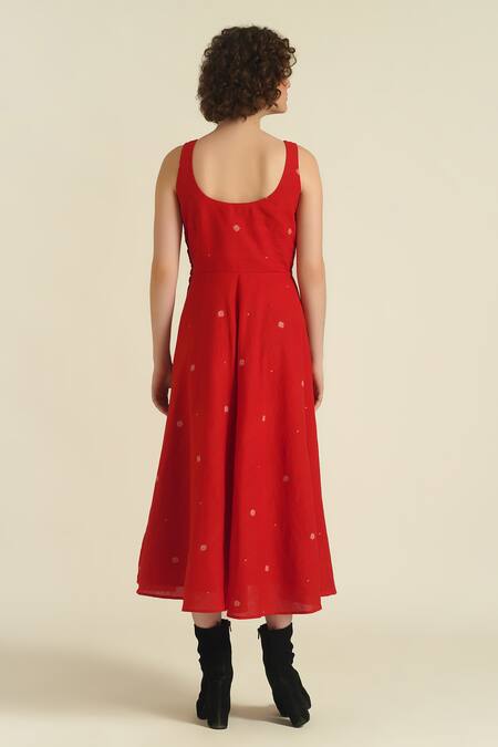 Red midi dress featuring all over woven jamdani floral patterns and a fit & flare silhouette