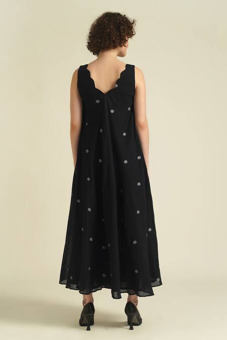 Black midi dress featuring a handwoven Jamdani polka dot pattern and scalloped cut work neckline