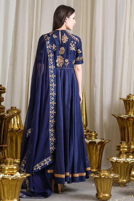 Buy_Sahil Kochhar_Blue Chanderi Embroidered Floral Crew Neck Anarkali Set _at_Aza_Fashions