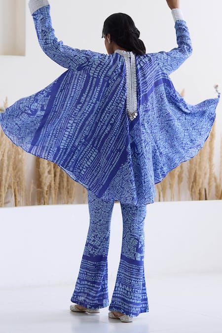 Blue draped top featuring abstract print with tassel and metal coin embellishments. Paired with matching bell bottom pant for a cohesive look.