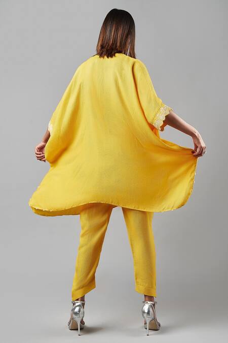 Yellow kaftan featuring delicate paisley embroidery with sequins and a handkerchief hem. Paired with matching pants for a coordinated look.