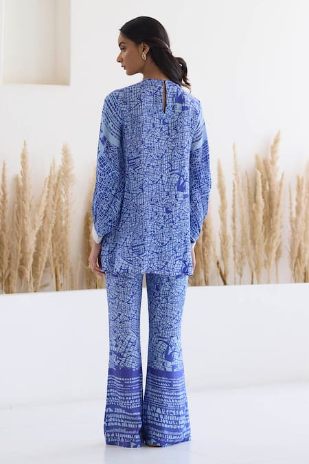 Blue gathered top featuring abstract print with silver dori, metal coin, sequin, patra & ghungroo embroidery. Paired with bell bottom pant in matching design.