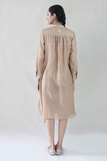 Beige Embroidered Chanderi Midi Dress