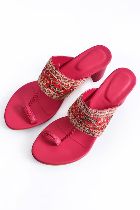 Hot pink block heels featuring a floral embroidered strap embellished with zari, sequins, and colorful thread work