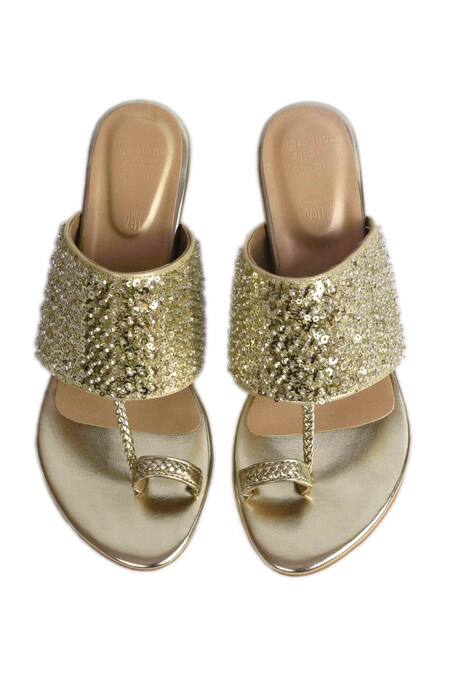 Gold Kolhapuri block heels featuring sequin and cutdana embroidery with a braided strap and toe ring detail. The heels have a comfortable height of 2 inches.