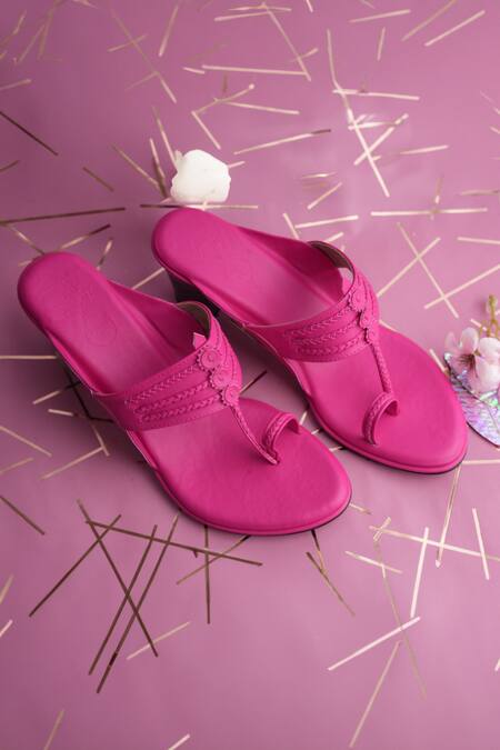 Hot pink kolhapuri toe ring block heels featuring braided strap applique detailing