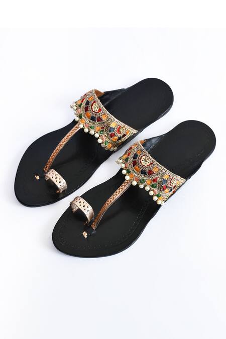 Buy_Irasoles_Black Embroidered Malaka Handcrafted Kolhapuri Flats_Online_at_Aza_Fashions