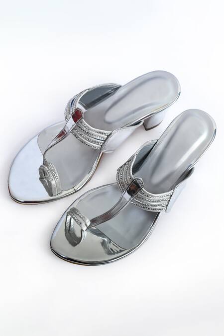 Silver faux diamond embellished kolhapuri block heels featuring a front T-strap and toe-ring