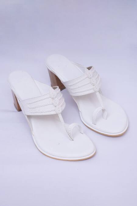 White kolhapuri toe ring block heels featuring braided strap applique detailing. Heel height measures 2.5 inches.