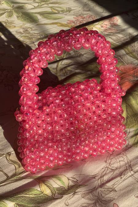 Pink mini bag with acrylic beads and a handle on top. Comes with a detachable chain sling.