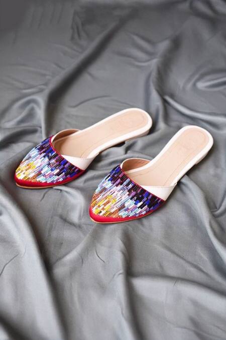 White and reddish pink mules featuring colorful beads, sequins, and anchor threads embroidery