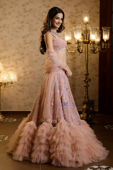 Buy_Isa By Dolly Wahal_Peach Net Crystals, Floral Butterfly Embellished Ruffle Bridal Lehenga Set_Online_at_Aza_Fashions